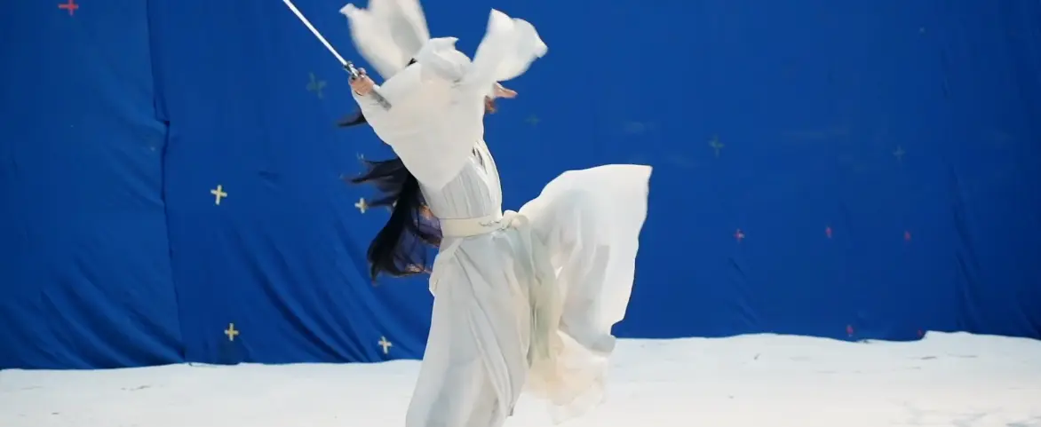 蒙着眼睛做 360 度旋转落地,稳得像钉在地上一样,连剑穗划过空气的声音都特别真实。