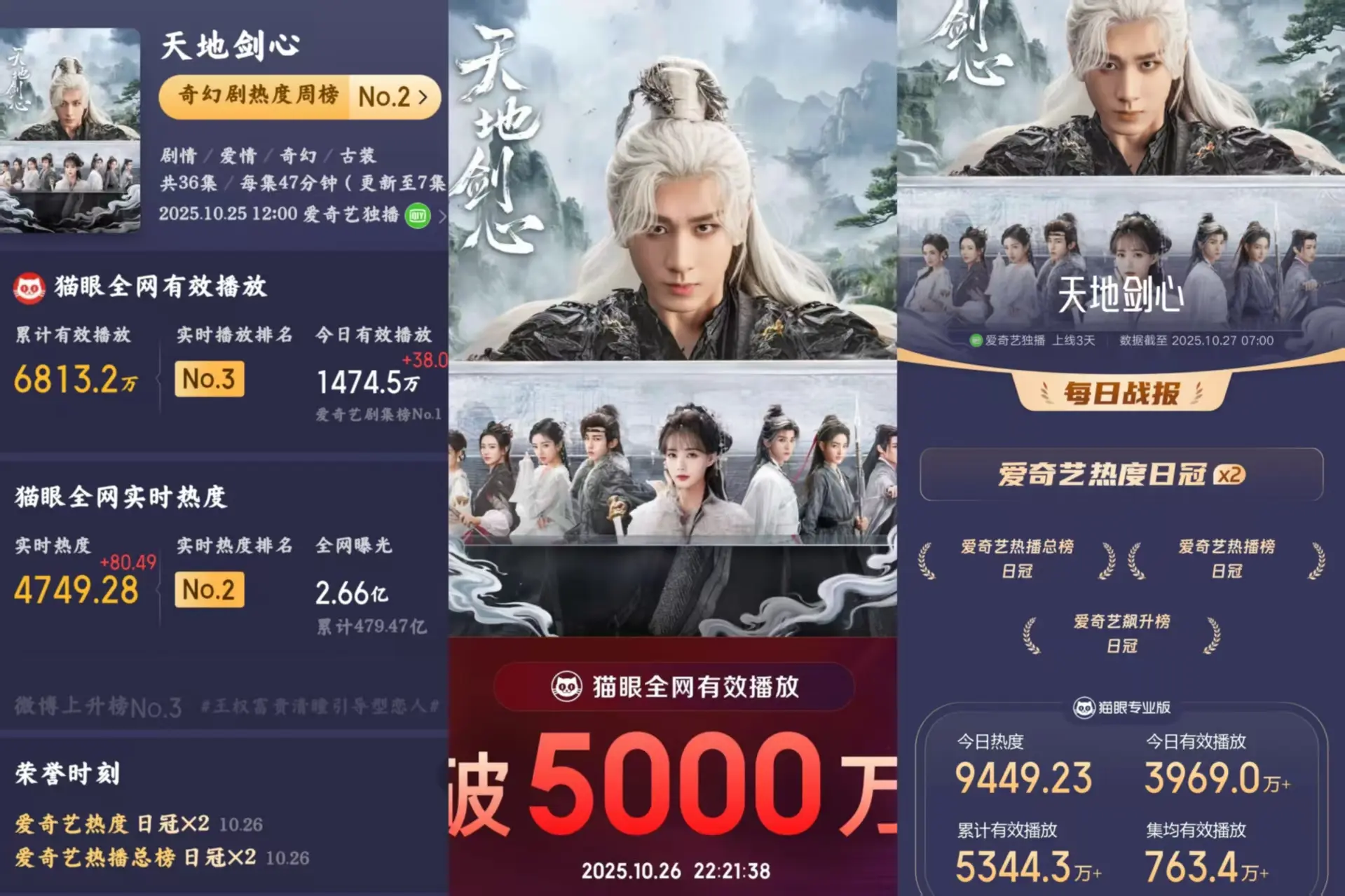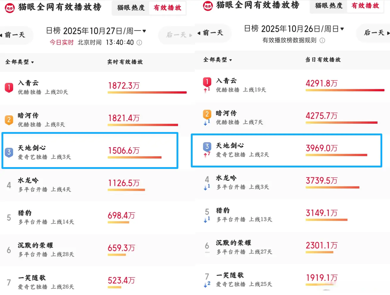 这才播两天,有效播放量就达到了5000万,日均播放量冲上了猫眼前3,并且连续两天拿下爱奇艺热度榜冠军。